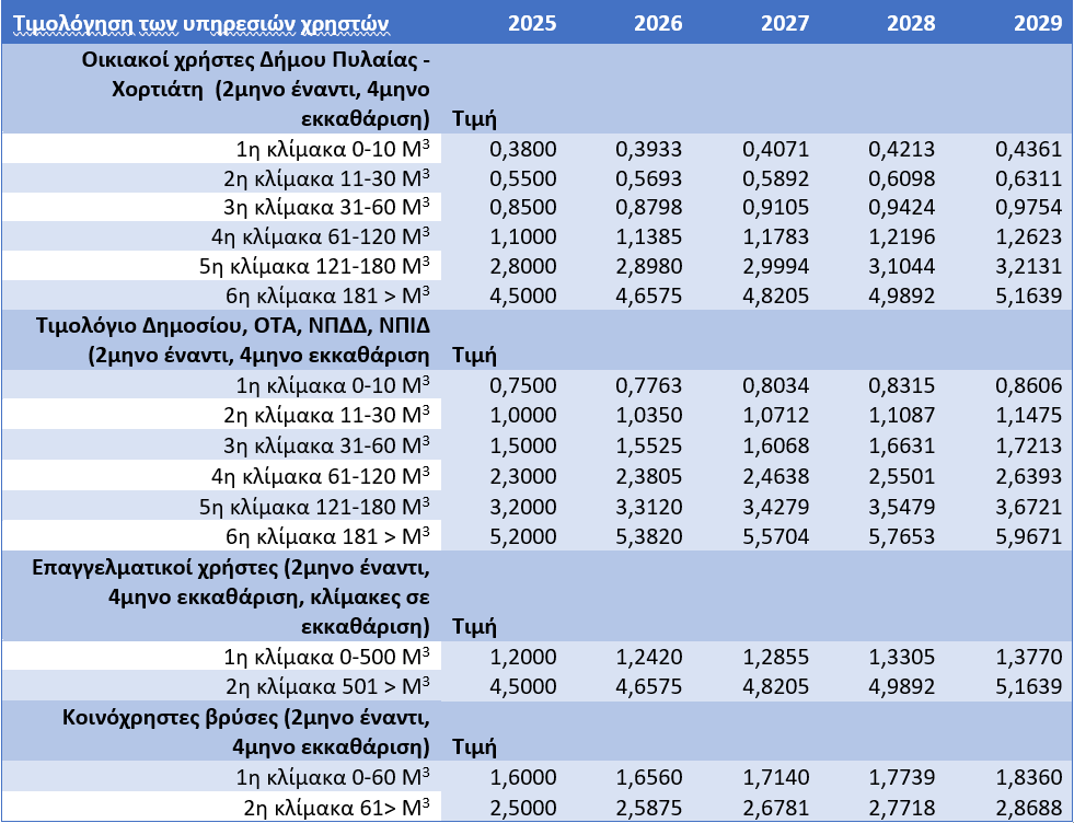Τιμολογιακή πολιτική υπηρεσιών ύδατος (Οικιακοί χρήστες, τουριστικά καταλύματα – επαγγελματικοί χρήστες, Δημοσίου, Δήμου, ΝΠΔΔ, ΝΠΙΔ)